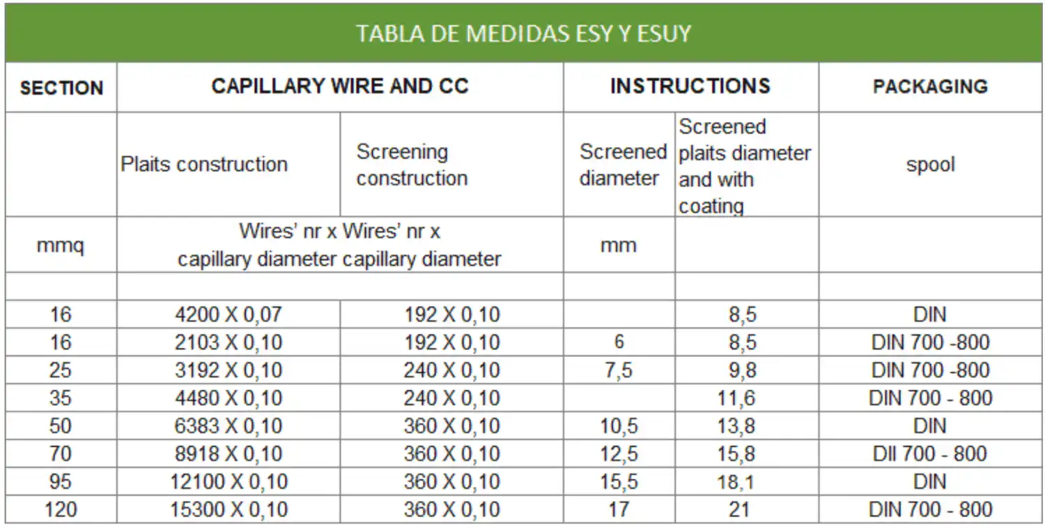 Están disponibles en secciones comprendidas entre 16 mm² y 120 mm². Bajo pedido, pueden suministrarse sin revestimiento o con cubiertas especiales de PVC o silicona, con o sin apantallamiento.